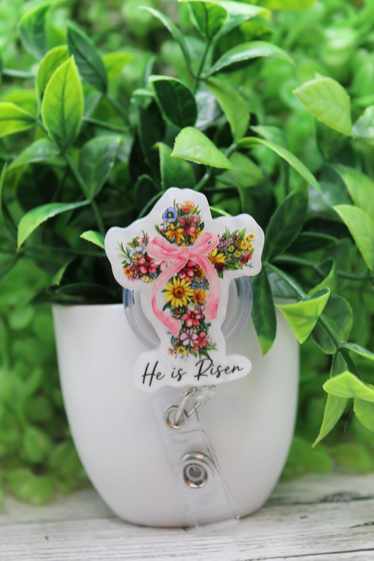 He Is Risen Floral Cross Badge Reel