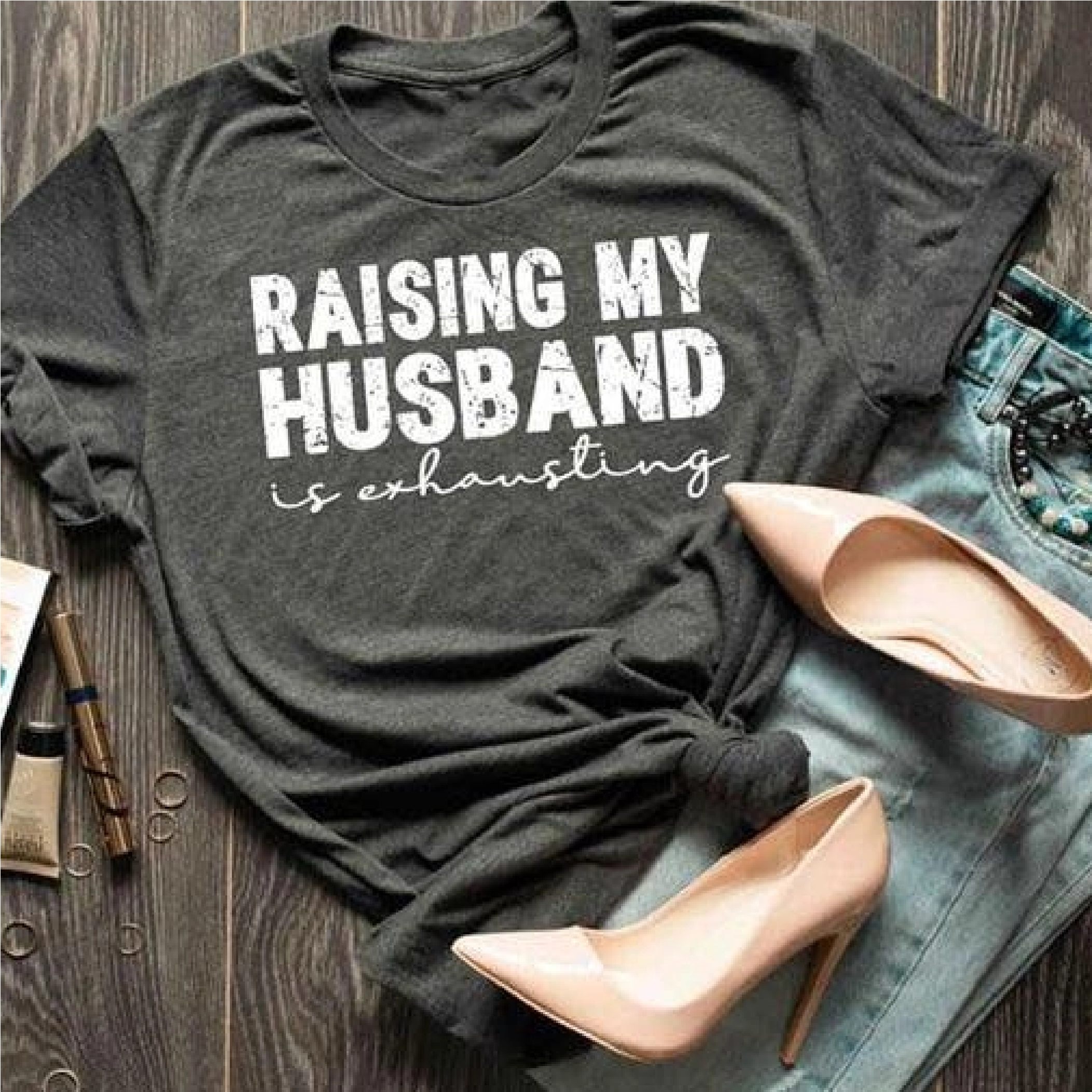 Elevate your humor and style with our ‘Raising My Husband is Exhausting’ Shirt.