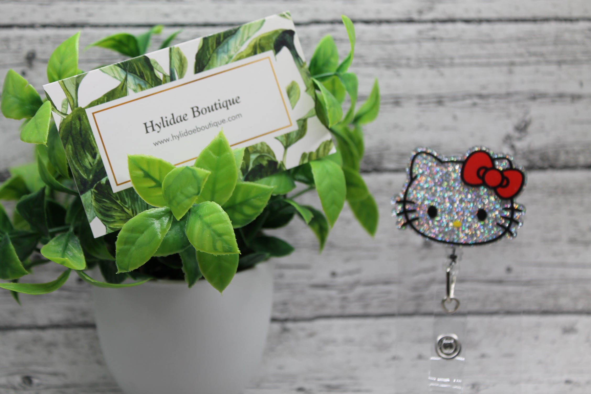 Silver Glitter Cat Face with Red Bow Badge Reel